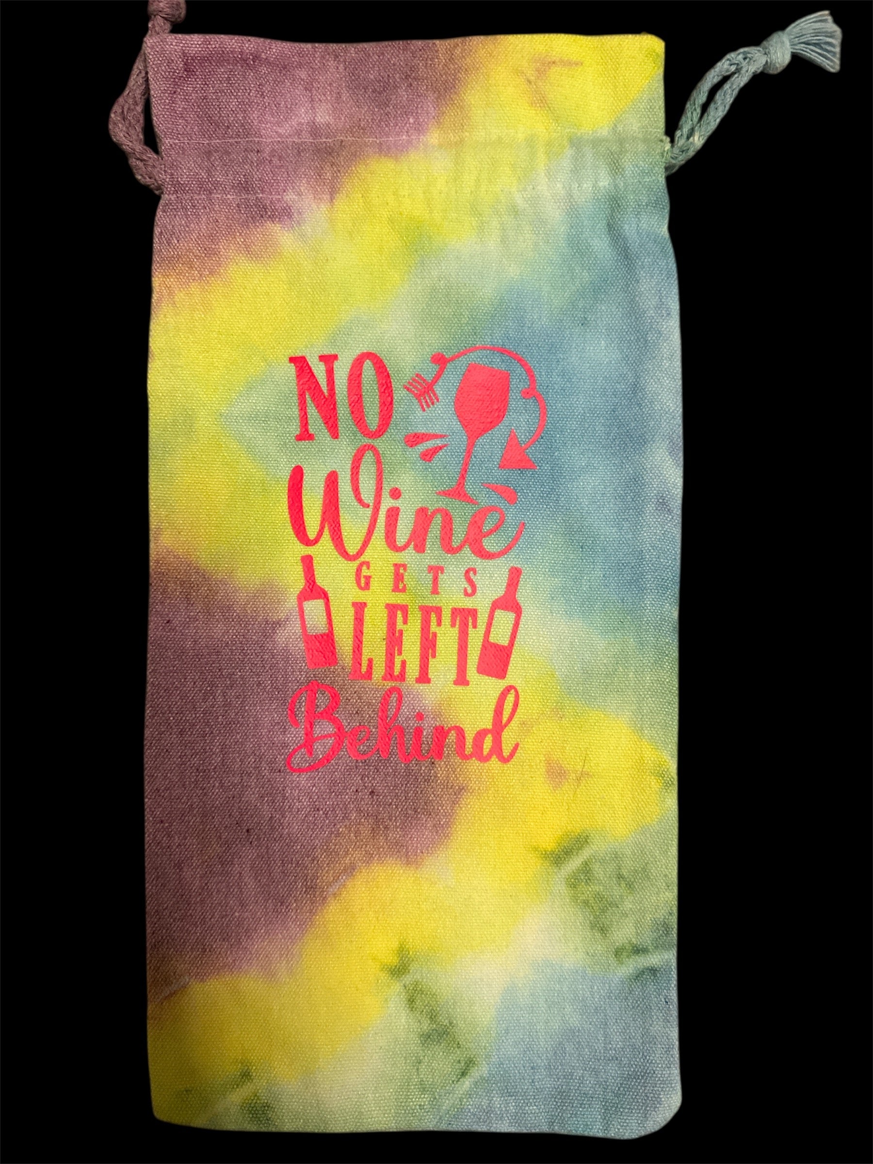 This stylish wine bag is perfect for gifting or personal use. It features a vibrant tie-dye pattern in pastel shades of pink, yellow, blue, and purple, adding a playful touch to your wine presentation. The front of the bag is adorned with a fun and bold phrase, "No Wine Gets Left Behind," in pink lettering, complete with wine glass and bottle graphics. The bag is secured with a drawstring closure, ensuring your bottle stays safe and snug inside. Ideal for wine lovers who appreciate a touch of whimsy with their wine accessories.