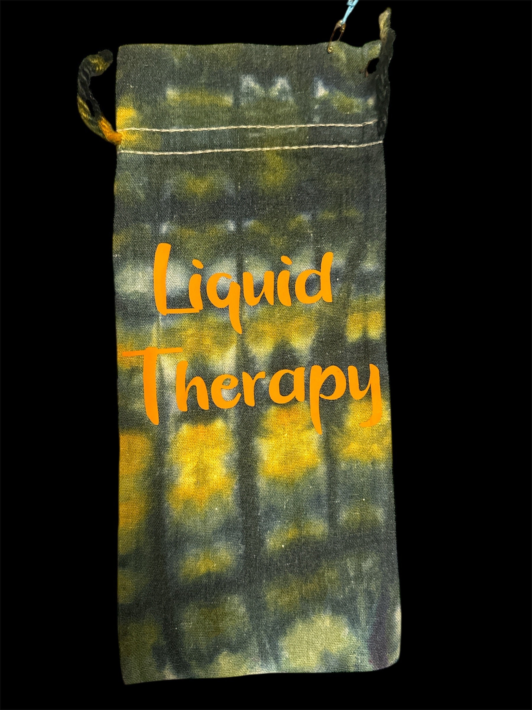 This wine bag is a stylish and vibrant accessory, perfect for gifting or personal use. It features a tie-dye pattern in shades of yellow, green, and gray, giving it a unique and eye-catching appearance. The phrase "Liquid Therapy" is prominently displayed in bold, orange lettering, adding a playful touch. The bag is equipped with a drawstring closure, ensuring your bottle is secure. Ideal for wine enthusiasts who appreciate a bit of humor and flair.
