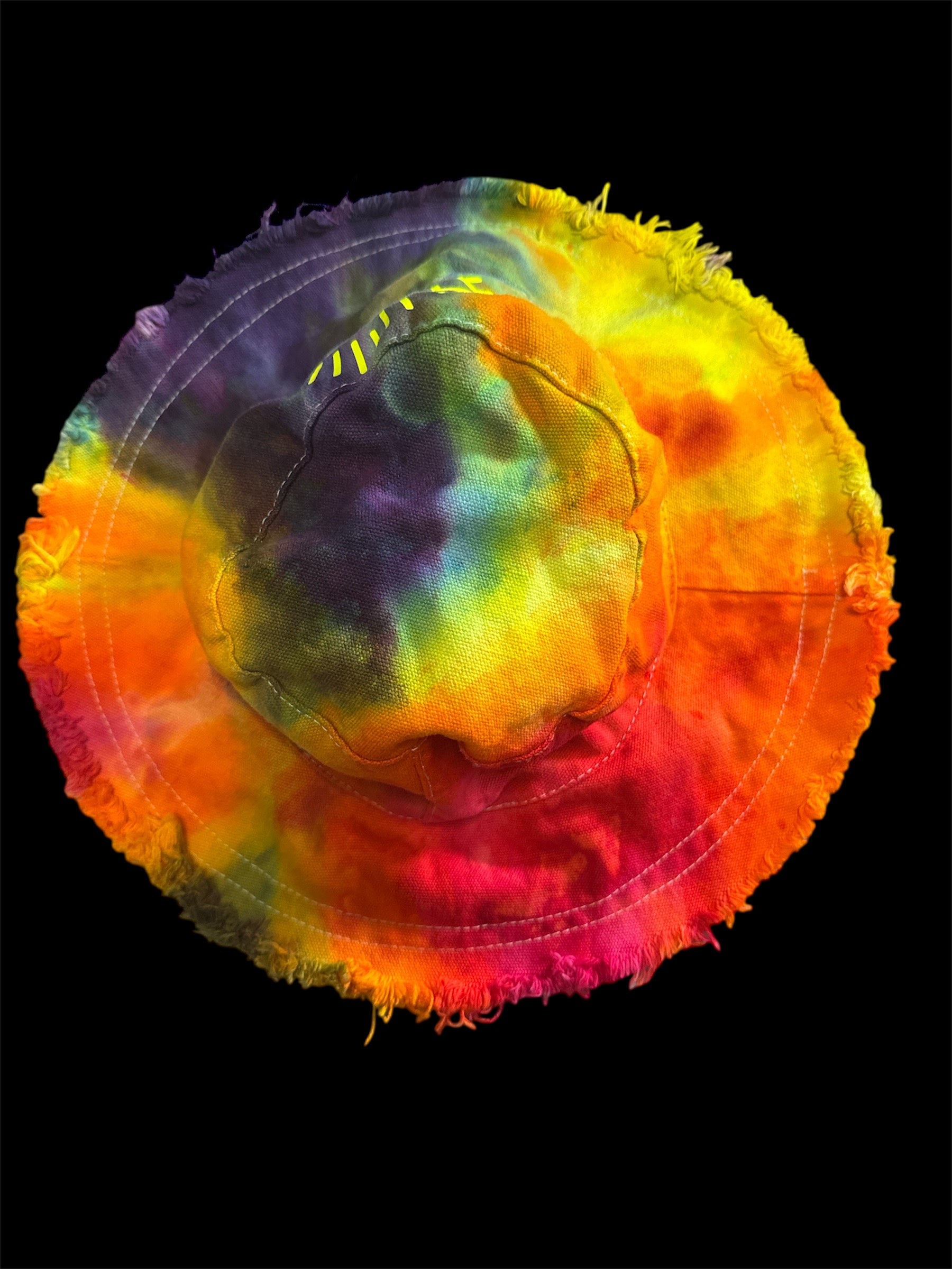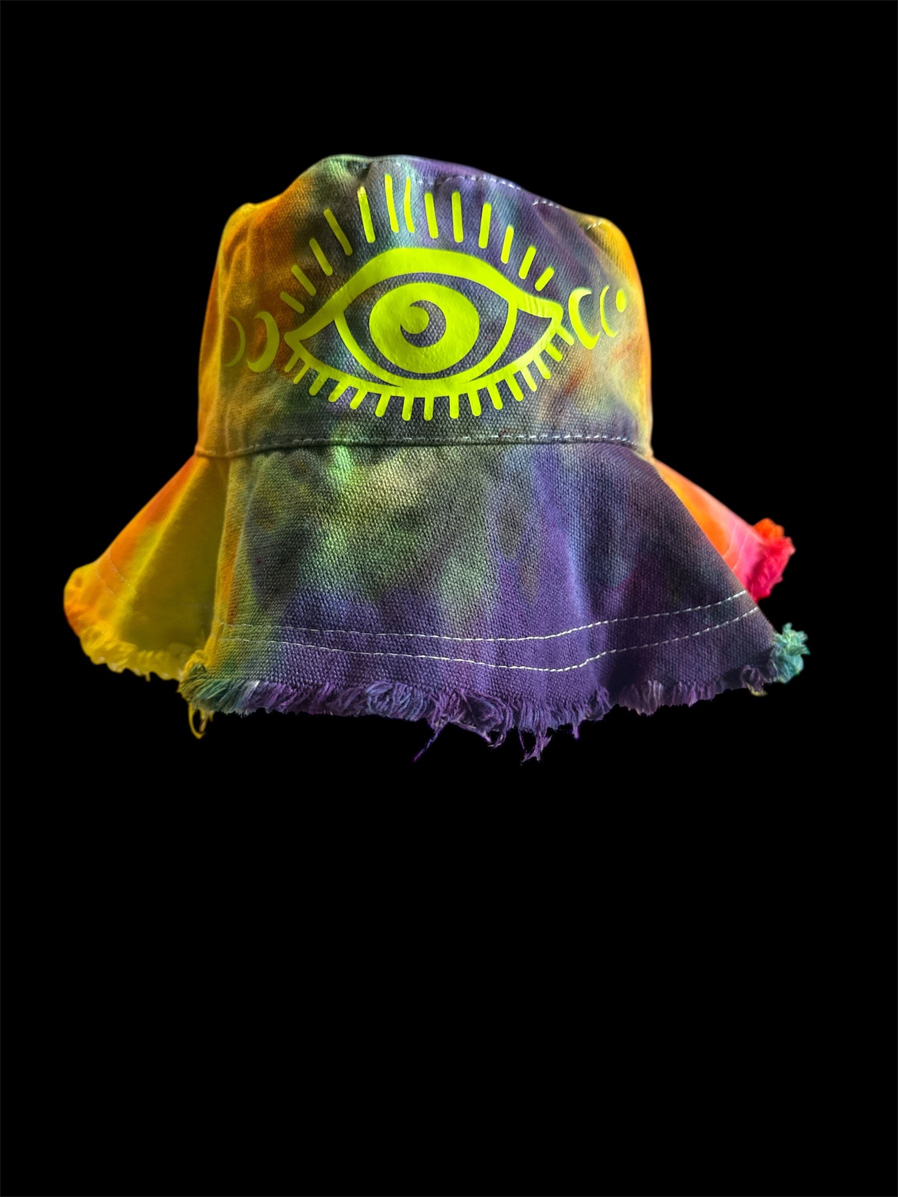 Add a splash of color and mystique to your wardrobe with this unique tie-dye bucket hat. Crafted from high-quality fabric, it features a mesmerizing eye design in bright yellow, set against a vibrant blend of rainbow colors. The frayed edges give it a trendy, bohemian touch, making it perfect for festivals, beach outings, or casual wear.